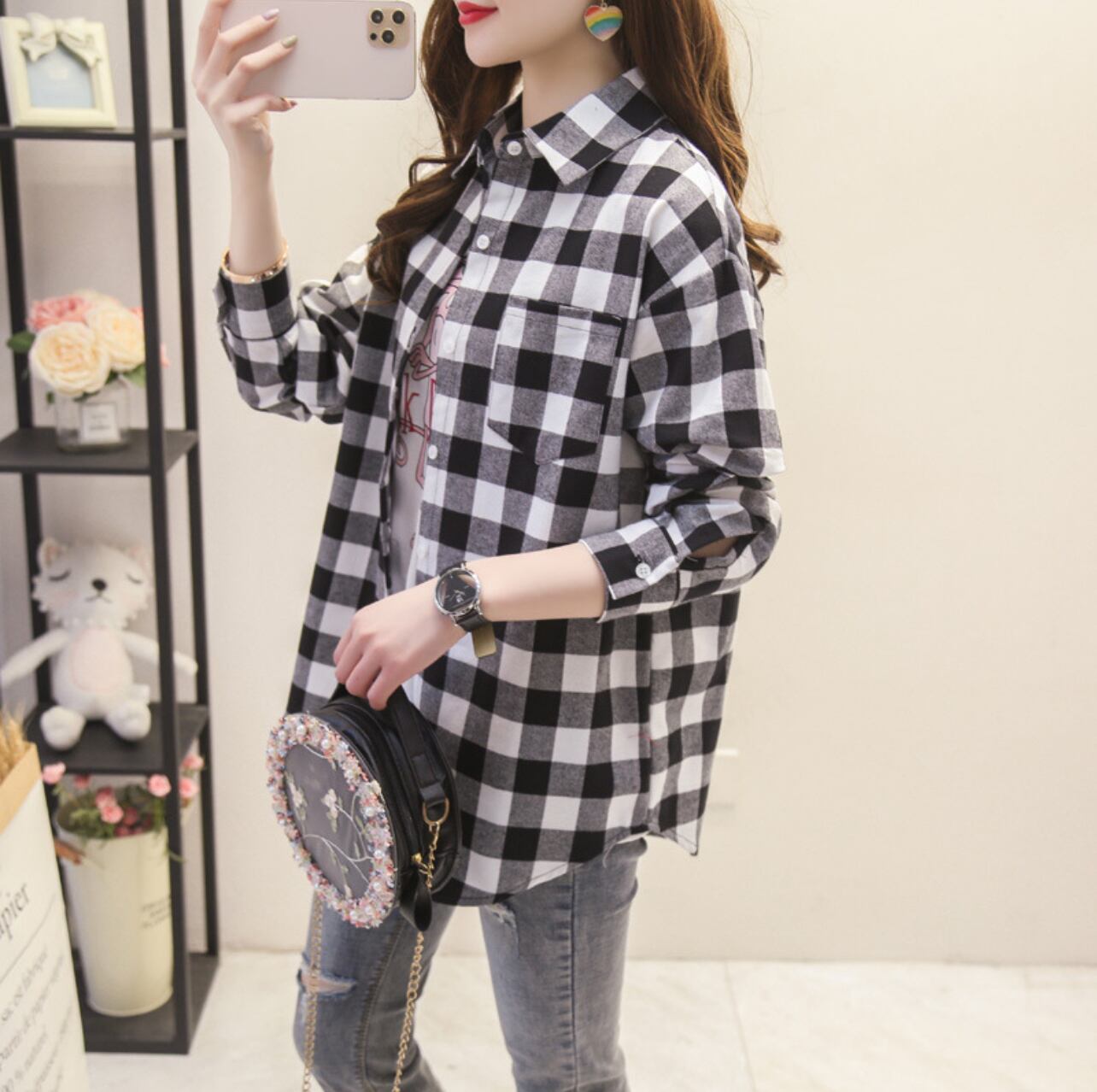 韓国ファッション チェック柄 シャツ レディース ゆったり