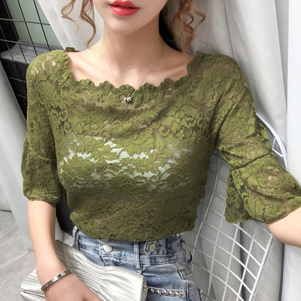 五分袖ブラウス春夏/シースルーインナー/花柄レーストップス